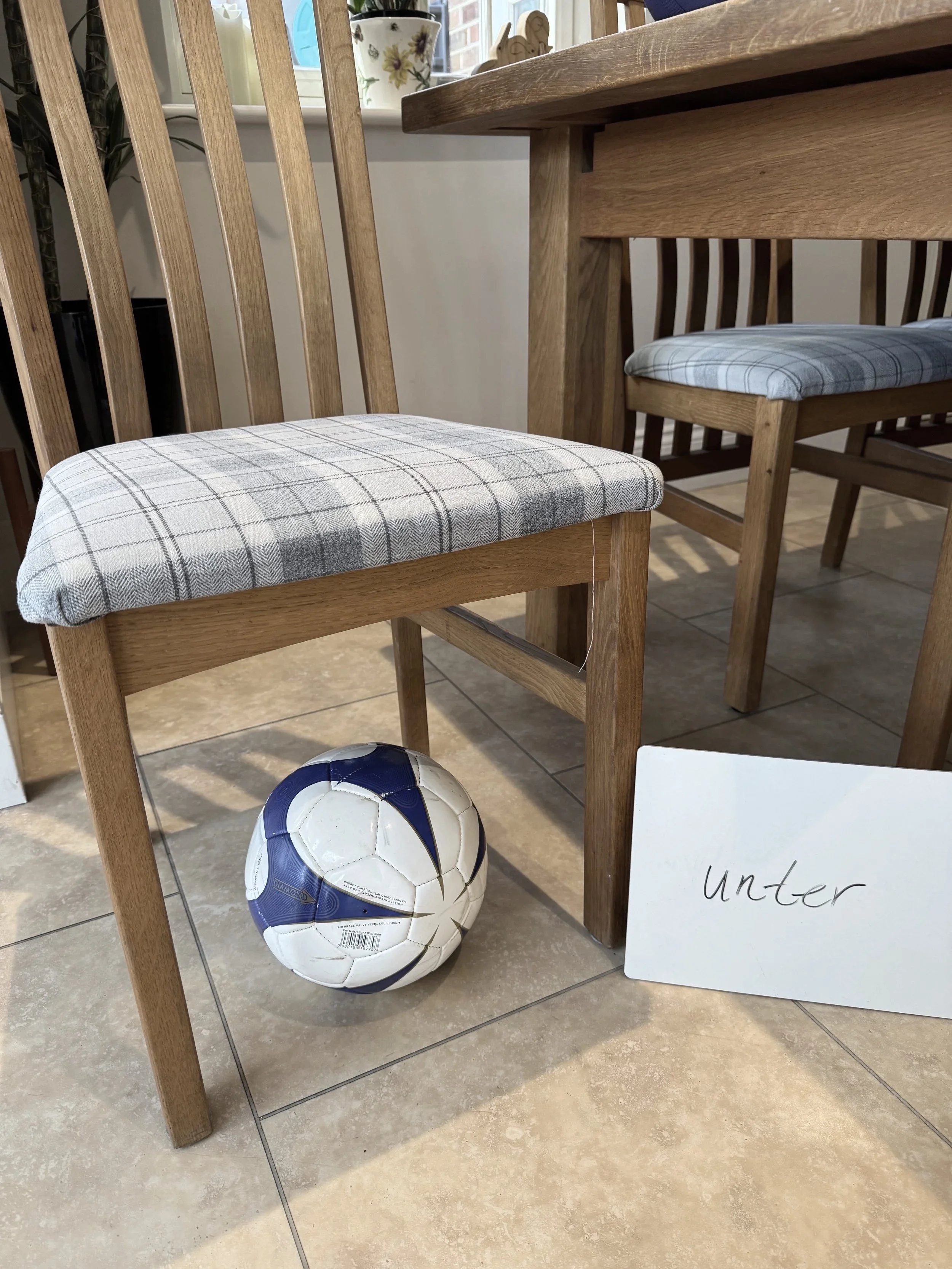 Instead, I plan my lessons so that we use the space and world around us. Prepositions - Why just write and repeat them? Let’s place real world items according to the preposition - Ein Ball ist unter/auf/neben dem Stuhl.